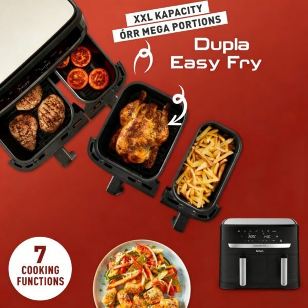 Tágas 9 literes XL / 9,5 literes kapacitás: A digitális légkeveréses fritőz tökéletes téglalap alakú kosaraiba egy egész csirke is elfér, és 15%-kal több főzőteret kínálnak, mint a kétkosaras légkeveréses fritőzök, így biztosítva az egyenletesen átsült eredményt.